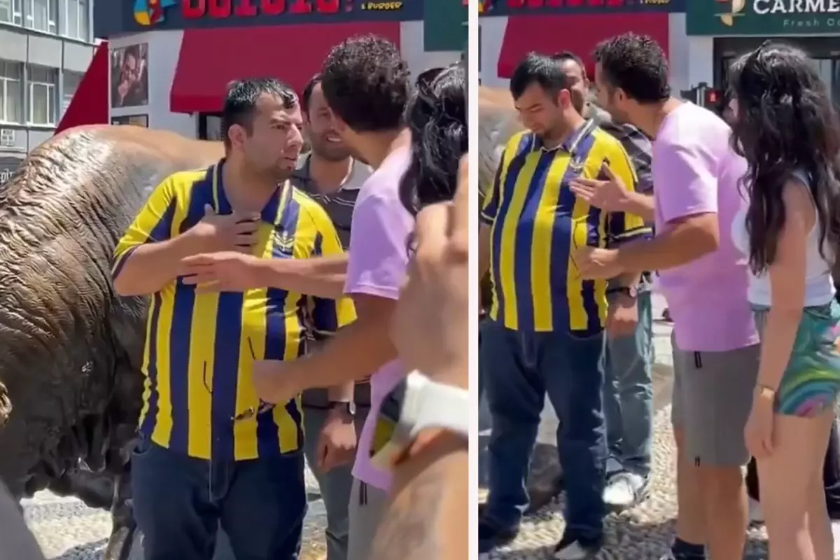 Son olarak Kadıköy'deki boğa heykelinin yanına götürülen Başaran, kameralar önünde "Sen Kadıköy Boğası değilsin, boğa burada!" denilerek kışkırtıldı.